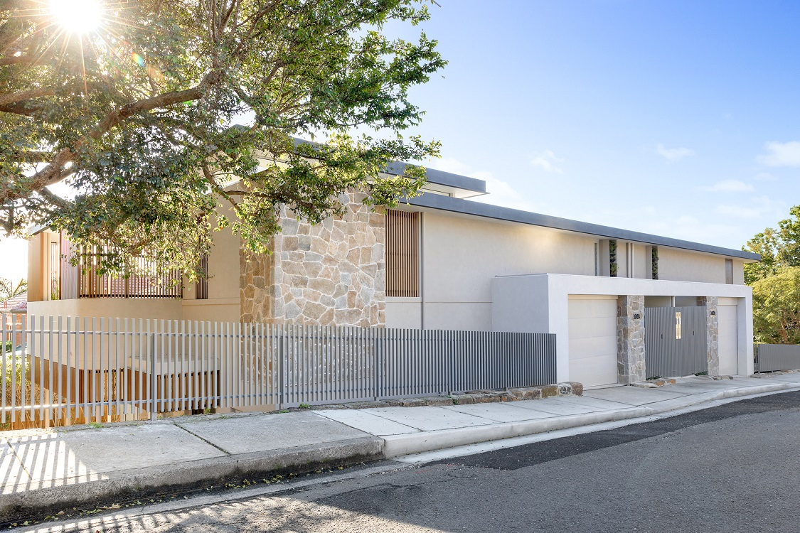 The unit on the south “peeks” past the other to get the view. It incorporates a hi-lite or cupola roof, increasing light, ventilation and sense of space. Stone is incorporated into the facade, picking up on the sandstone retaining wall on the east boundary. The first floor balcony is large with extensive planters boxes.